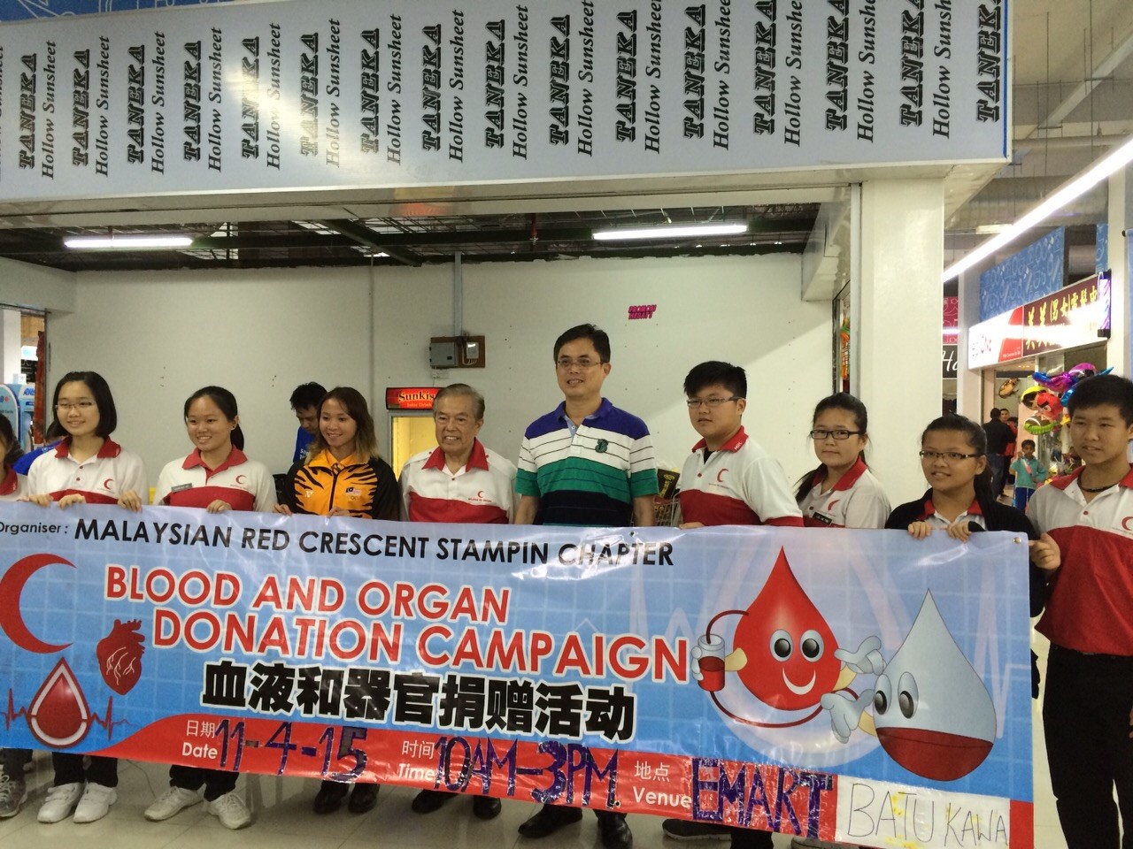 A blood donation campaign has been organised by the Malaysian Red crescent , Stamping Chapter at E-mart supermarket, Batu Kawa, 2pm on 11/4/2015. The organiser invited National Olympic Diving medalist Pandelela, and SUPP youth chief Cr Tan Kai to give moral support to blood donors. Photo : Mr Chong Choon Chiang- Chairman of Red Crescent, Stamping Chapter.