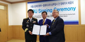 砂地方政府部长拿督沈桂贤医生于本月2日在韩国首尔九老市,见证首尔消防与拯救队伍与古晋南市市政局之间签署备忘录。 该备忘录内容是韩国首尔消防与拯救队伍移交两辆状态良好的消防车,供本地志愿消拯队使用。 九老市此前与古晋南市缔结为友好姐妹市。 代表首尔消防与拯救队伍签署备忘录者是该队负责人Kwon Soon Kyung,而南市则是由市长拿督曾长青代表。