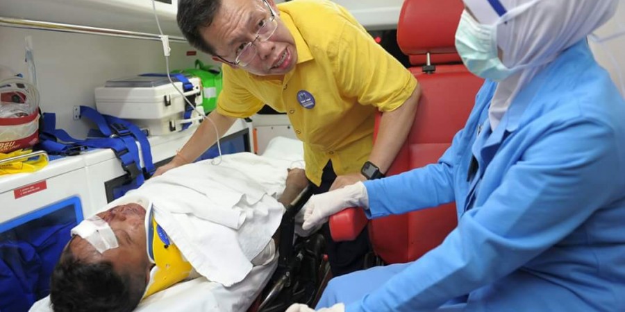 A motorcyclist was hit by a car at about 10 pm along Jalan Sg. Moyan. When Dr. Sim heard that the victim was seriously injuried, he left his ceremah and went to the ambulance to assist the nurse.