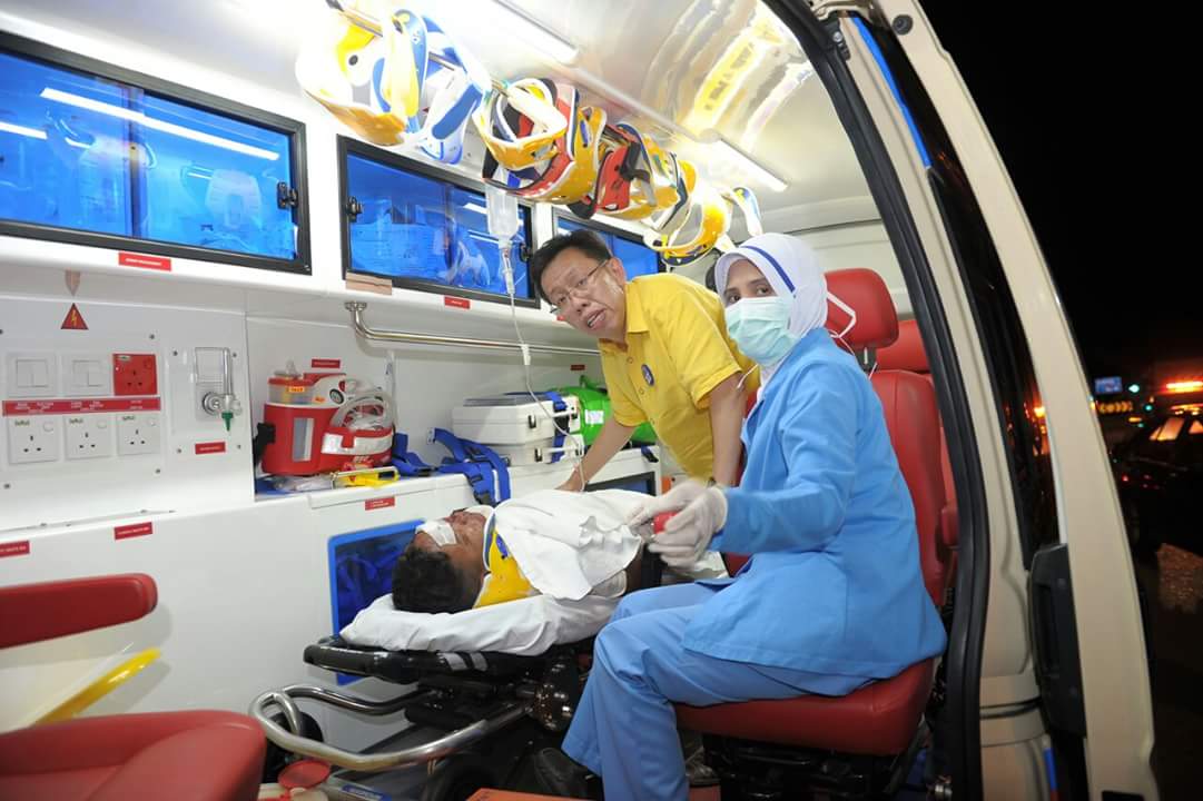 砂人联党主席兼石角区候选人拿督沈桂贤上议员于昨晚紧急离开其政治演讲集会,赶去救援车祸伤者,其热心举动获得民众赞扬。