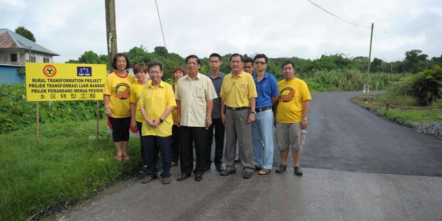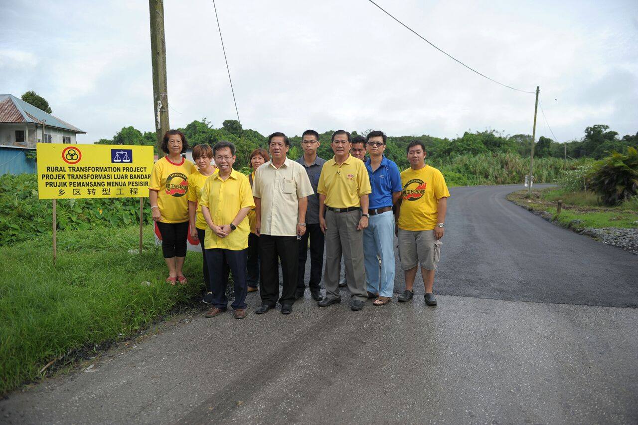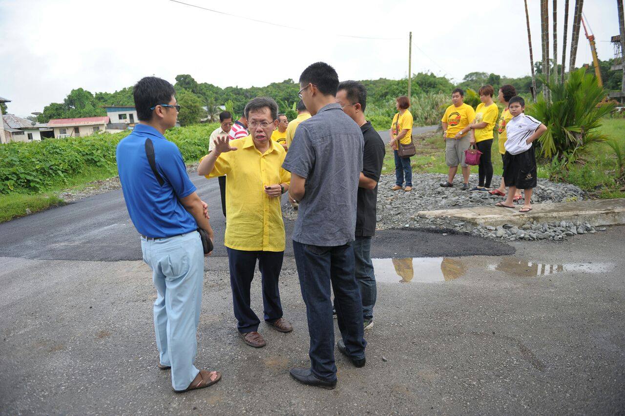 新任州地方政府部长拿督沈桂贤医生在砂人联党石角支部主席拿督斯里陈如飞与公共工程部工程师及石角支部领袖陪同下视察下沙垅路及西里益路扩充与重铺沥青工程。