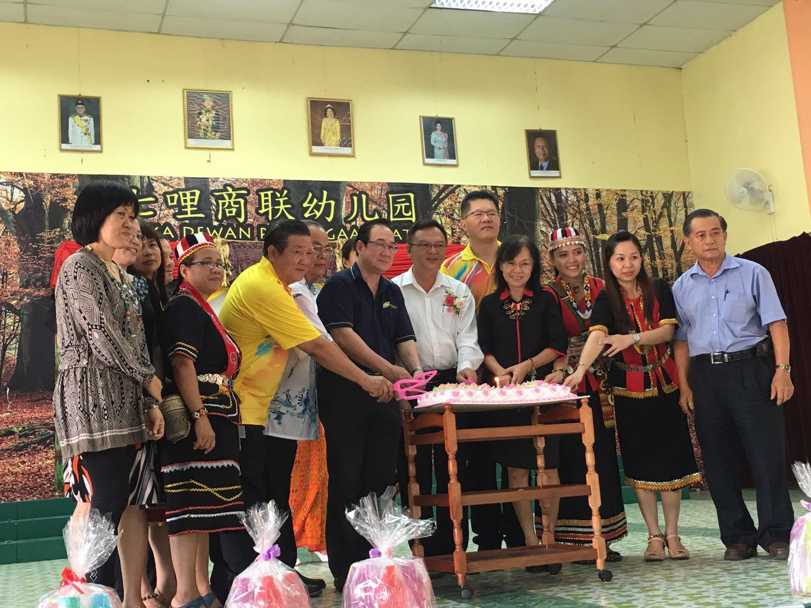 The school board, teachers and parents join in the celebration of the Gawai.