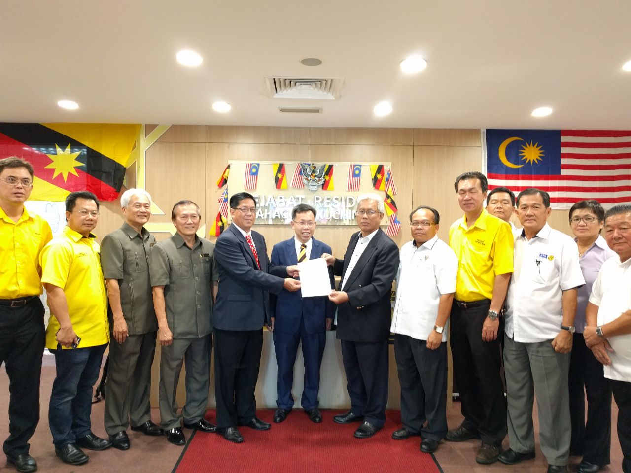 砂地方政府部长拿督沈桂贤于昨日见证陈如飞从古晋省长苏卡宁手中领取新任天猛公委任状。