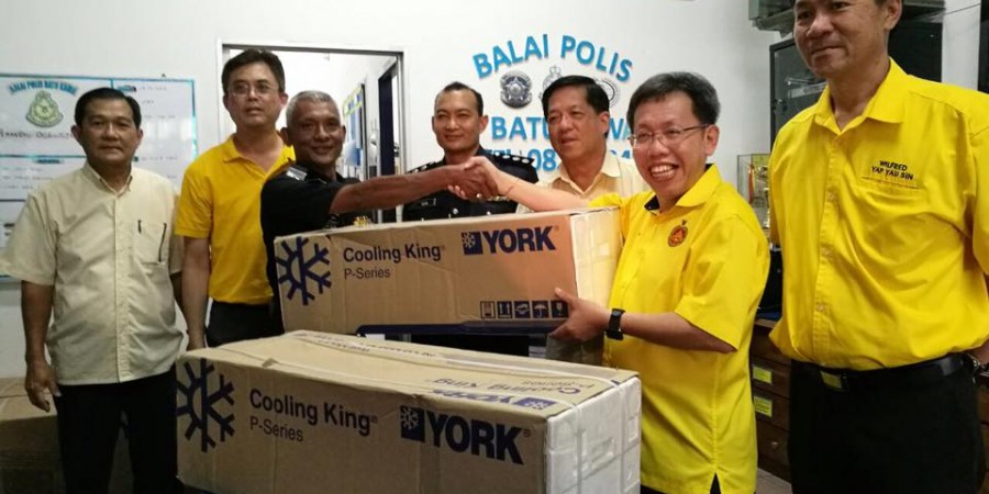 砂地方政府部长兼石角区州议员拿督沈桂贤于日前为石角新市镇警署献上两家冷气机和椅子。