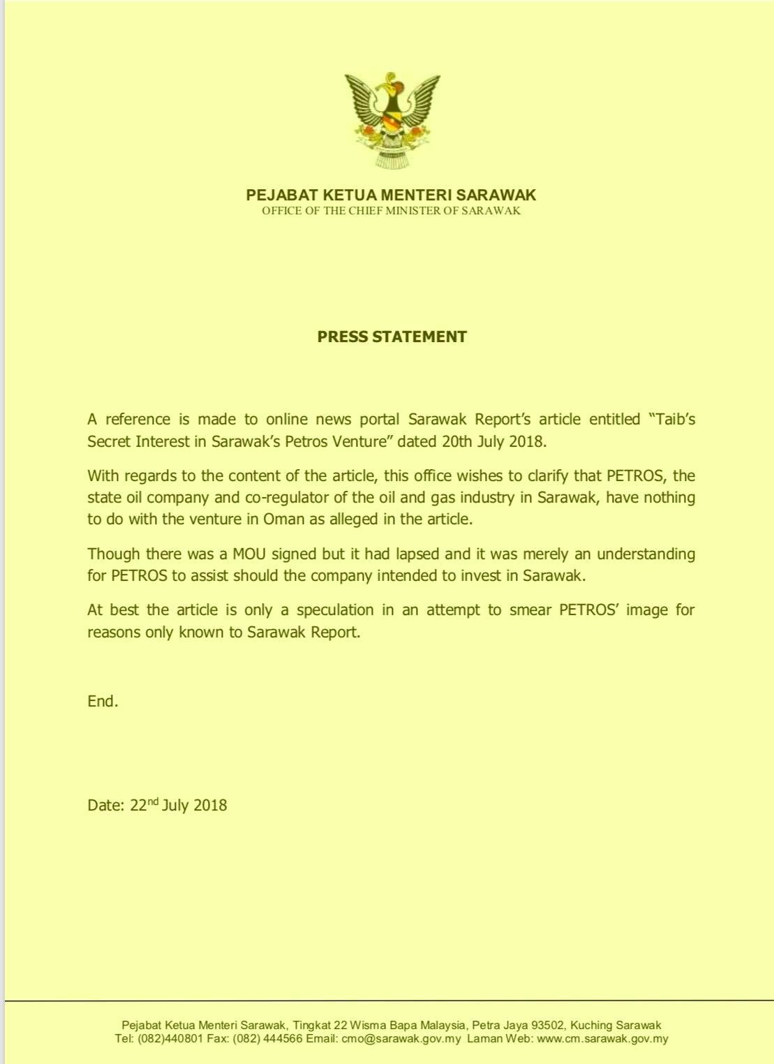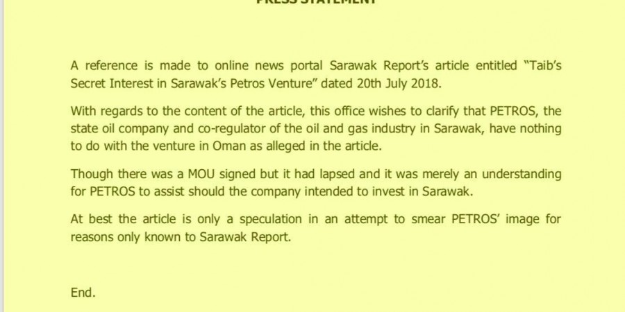 The statement wishes to clarify that Petros, the state oil company and co-regulator of the oil and gas industry in Sarawak, has nothing to do with the venture in Oman as alleged in the article’.
