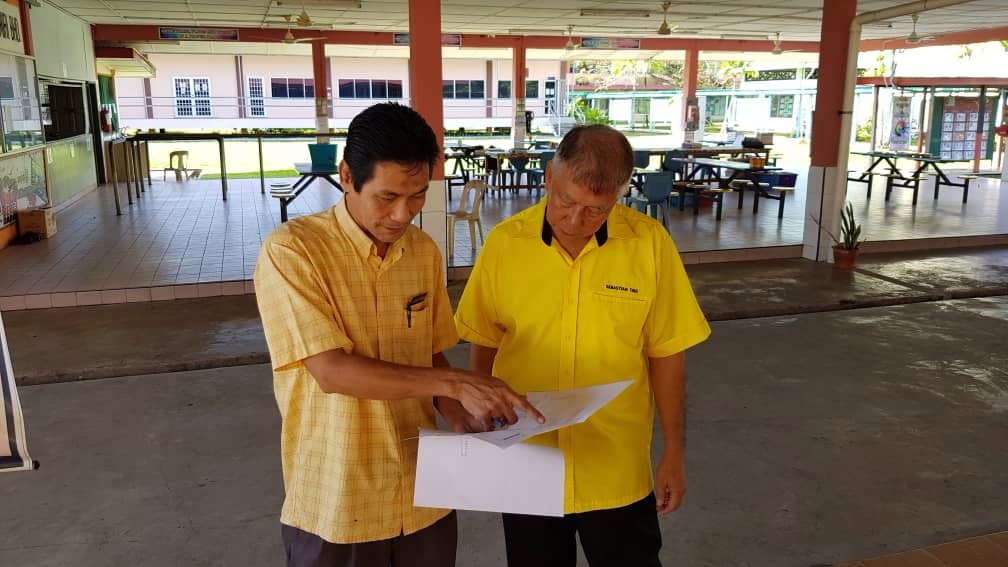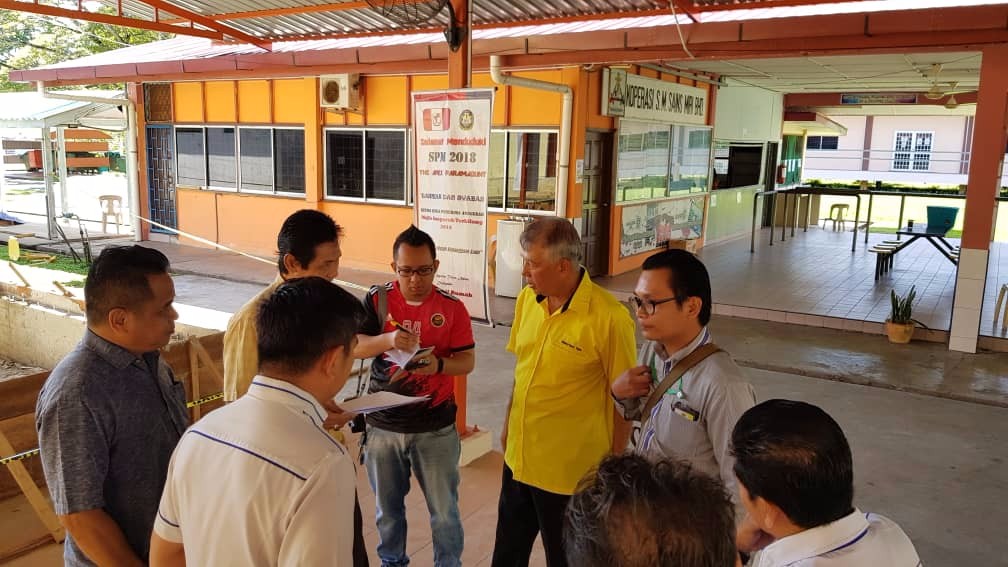 In the first school he went to SM Sains with JKR officer representative and the contractor to see the construction of a stage and netting for the hostel to prevent mosquitoes.