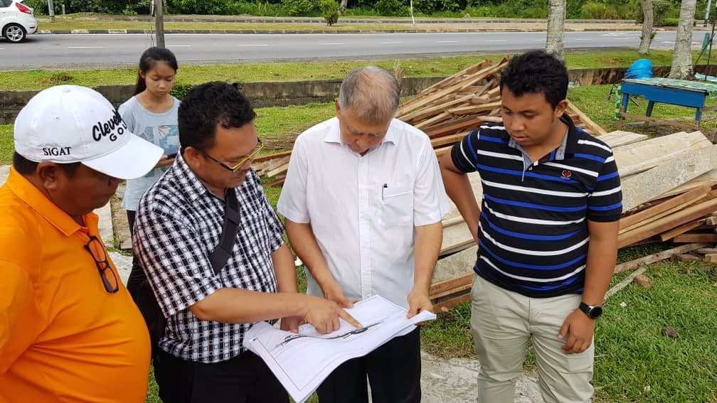 砂人联党卑尔骚区州议员拿督陈超耀今早与美里市政局市议员及工程师巡视美里海滨小贩中心的提升工程。