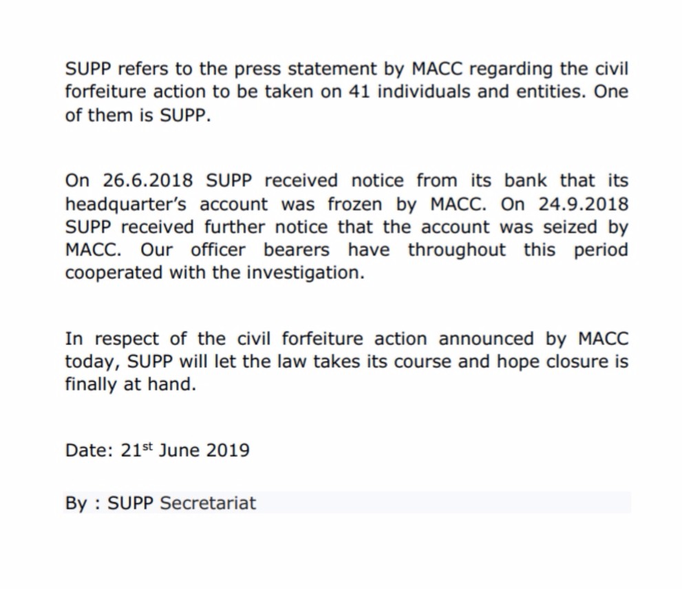 砂拉越人民联合党秘书处今日针对大马反贪会采取法律行动,追讨一马发展公司(1MDB)2.7亿令吉资金一事,作出回应。