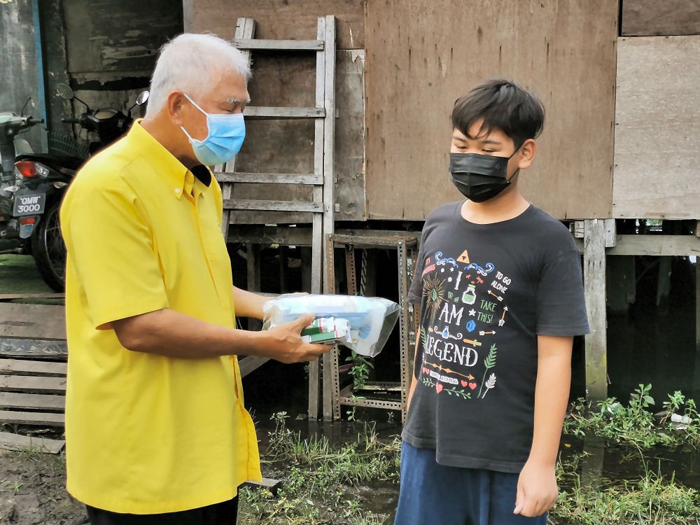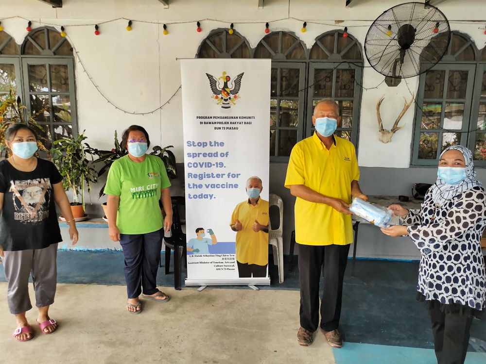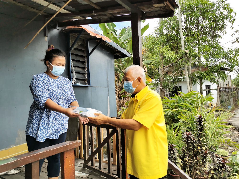 砂旅游、艺术与文化部助理部长兼卑尔骚区议员拿督陈超耀律师在卑尔骚区人民社区发展计划下,派发56份包含各种防疫物品的“安全套件”予史纳汀再也居民。