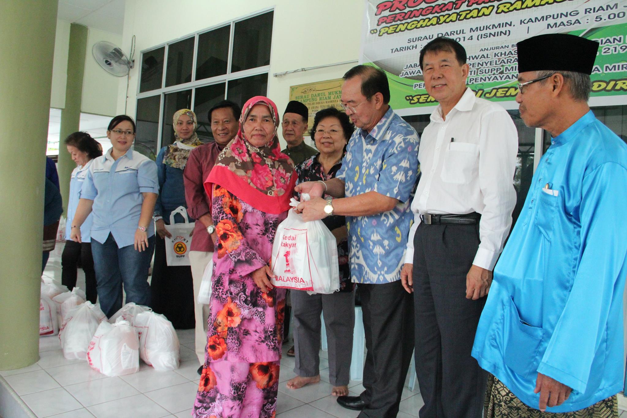 In conjunction with the month of Ramadan, Tan Sri Peter Chin and his wife, Ruby, and Piasau Branch Chairman, Dato’ Sebastian Ting, went to the Kampung Riam Jaya yesterday to give out food and goodies to the less fortunate there.