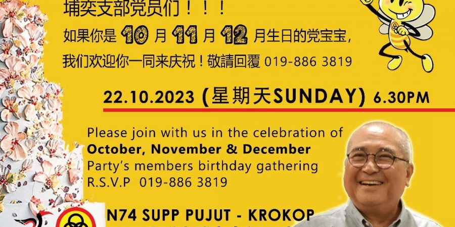 N74人联埔奕支部与珠巴分部将于10月22日(星期日)晚上 6 时 30 分,在位于卑尔骚路旧桥商业中心,洛 3486,2楼党所Sa’ati 礼堂举办10 月,11 月,12 月党员庆生日及欢迎新党员。