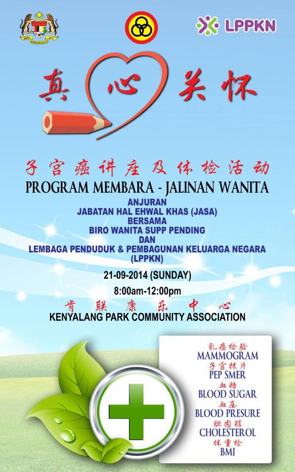 人联党朋岭支部妇女组联合特别事务部JASA及国家人口及家庭发展局 LPPKN,将于2014年9月21日(星期天)上午8时至中午12时假古晋肯雅兰康乐中心(肯雅兰菜市场后面)主办一场健康讲座说明会和身体检查活动,身体检查内容包括乳腺癌检查,子宫膜片检查,血糖检查,血压检查,胆固醇检查和体重检查。 根据马来西亚国家登记常年报告(National Registry Report)乳腺癌是马来西亚女性第一癌症杀手,第二个最常罹患的癌症是子宫颈癌。研究显示在三大民族中华族女性患上乳腺癌几率高于马来人和印度人,而且患病的年龄趋向年轻化。 乳腺癌和子宫颈癌的罹患病例原因除了遗传因素外,还有许多环境和客观因素造成,如嗜烟酒、长期手机贴身、长期使用电脑、长期接触各类化学和金属加工品,长期饮用高度致癌物的水和食用打过激素的食品,例如鸡肉、人工海产产品、含瘦肉精的肉质产品等等。 由于现代人生活环境的变化,人联党朋岭支部妇女组希望通过主办这项座谈会和身体检查活动以提升妇女姐妹和公众人士对乳癌和子宫颈癌的认识,同时鼓励妇女提早和定期检查身体,加强防范罹患癌症的危机意识。 这次的身体检查活动获得国家人口及家庭发展局 LPPKN属下的诊所Klinik Nur Sejahtera的配合,利用流动巴士诊所提供各项免费体检服务,公众人士在注册之后将会安排在备有完整医检器材的流动巴士内进行体检。 此外,配合这项活动人联党朋岭支部妇女也邀请著名的医疗和辅导讲师傅春枝女士主讲“子宫颈癌的预防与治疗”,傅女士是前古晋中央医院护士长,是位临床医疗和辅导经验丰富的白衣天使。 人联党朋岭支部妇女组希望妇女姐妹能够踊跃出席这项免费的乳腺癌和子宫膜片检查,除此之外也欢迎公众人士无论男女老少前来进行免费的血糖、血压、胆固醇、体重检查。