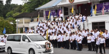 砂人联党领袖与党员于今早在党总部,向已故前任党主席丹斯里拿督巴丁宜黄顺开致敬。 载着黄顺开灵柩的队伍,是今早从丧府出发前往三一堂进行追思礼拜之前,途经王其辉路,在砂人联党总部停下,接受砂人联党领袖与党员献上最高敬意。 在场的人联党领袖首先将党旗盖在灵柩车上,这是人联党的传统,表达对前任党魁的最高敬意。 之后,在两名前任党主席,分别为拿督巴丁宜陈康南医生和丹斯里陈华贵的见证下,人联党秘书长拿督陈超耀和副主席拿督李景胜将党旗移交予杨守勤,在场还包括黄顺开长子黄祈亮、长女黄祈美和幼女黄祈琳。 多名人联党前任和现任领袖,包括前任秘书长拿督沈庆辉、前任财政拿督邓伦奇、巴都吉当区州议员罗克强、中央青年团团长兼首长政治秘书陈开、妇女组主席拿汀徐美丽以及来自全砂各个支部的领袖皆出席今早仪式。