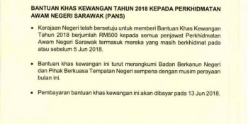 The Sarawak government has decided to give RM500 Special Financial Aid to civil servants in conjunction with the festive season this month. A press statement from the Chief Minister’s Office said the special aid will be paid on Wednesday (June 13). The civil servants who qualify include those still serving on or before June 5. The special financial aid also includes Sarawak statutory bodies and local authorities.