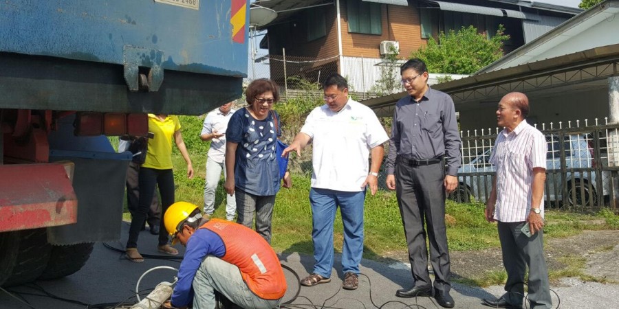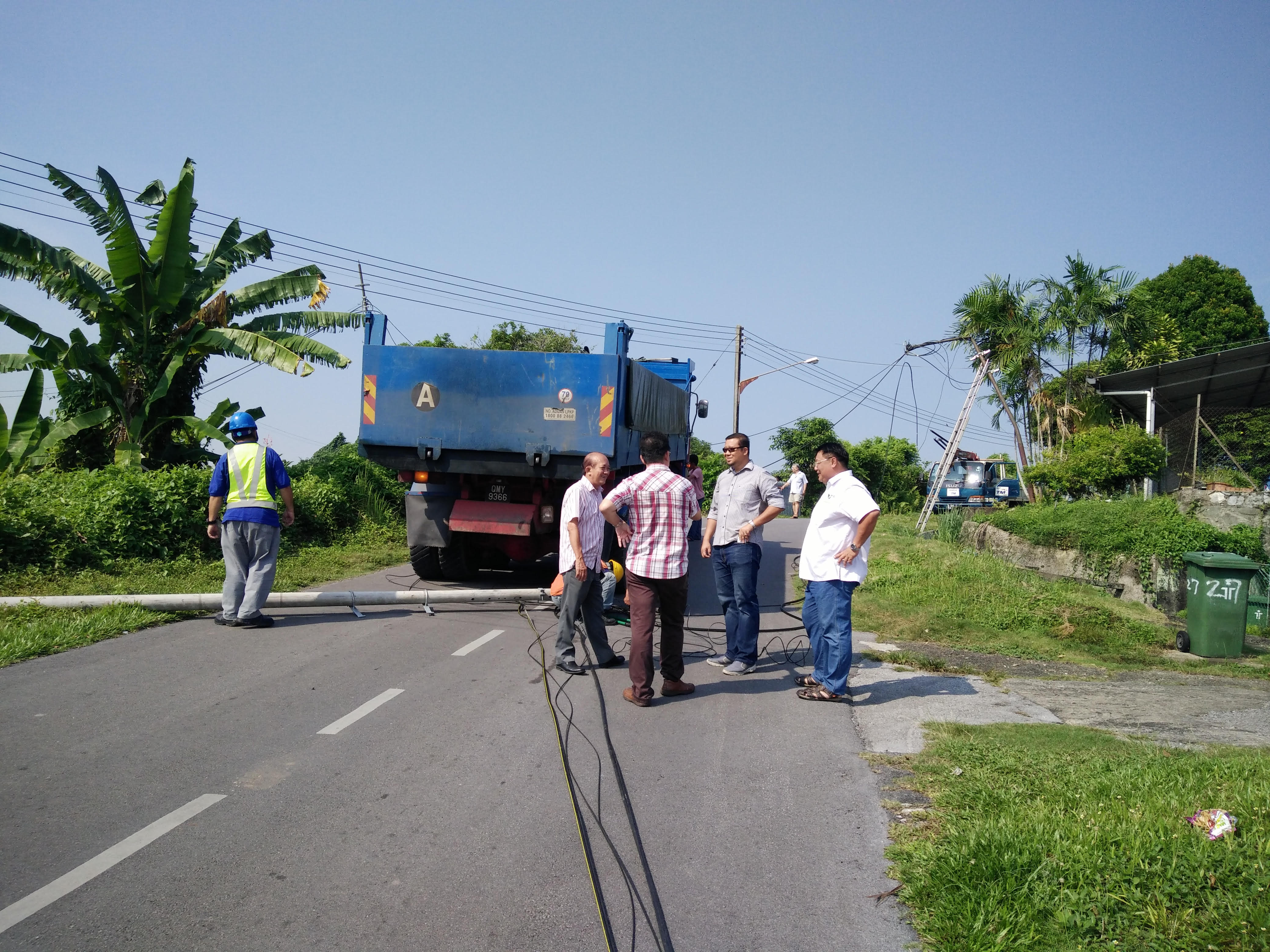 Kapitan Daisy Chan, MBKS Councillors Patrick Song and Ong Chee Chiang, SUPP Pending Branch Deputy Chairman Chan Chaw Yam, Sarawak United Peoples’ Party (SUPP) Pending Youth Committee went to inspect two telephone poles which had fallen across the road which can disrupt smooth flow of traffic, following an accident at Three Hill Garden.