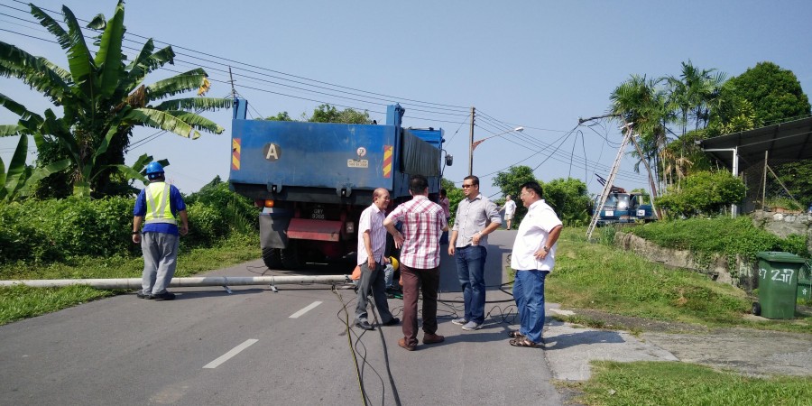 该服务队于今早大约7点接获三山花园民众的投报有关第八巷的电线因重型罗里车通过时,被其车斗勾致,导致两个电线柱应声倒塌,影响当地交通。