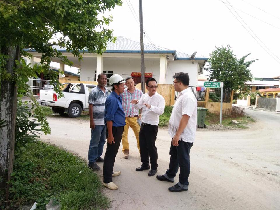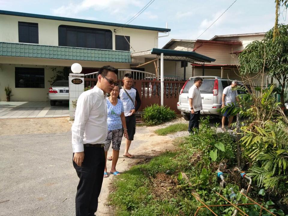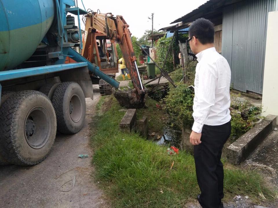 砂人联党青年团宣教秘书符祥威于日前和吴芝辉市议员一起巡视双溪亚邦巴鲁的沟渠工程。