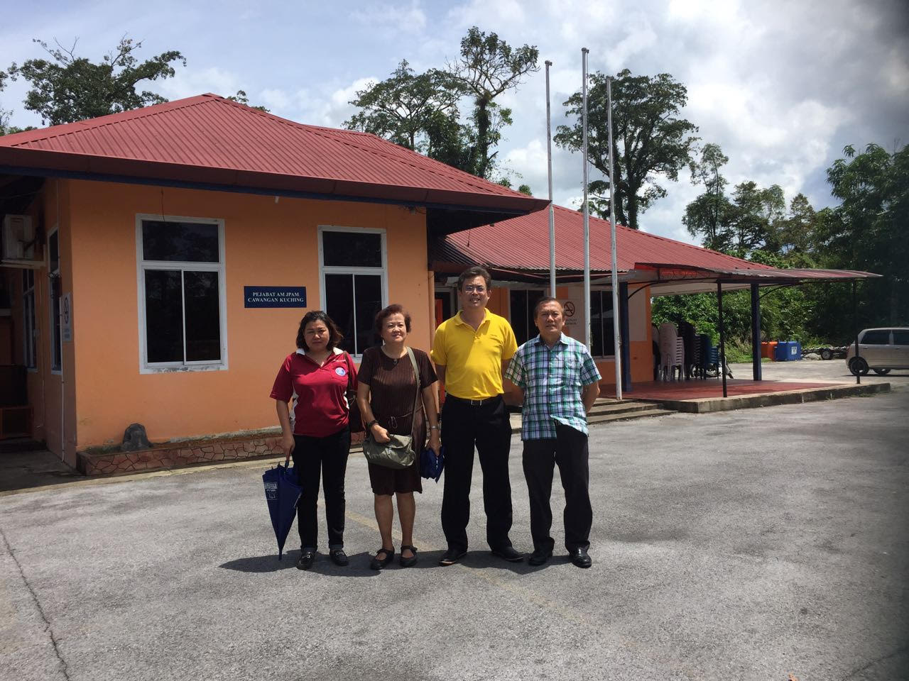 砂人联党青年团总团长兼首长政治秘书陈开及社区领袖包括本固鲁严安干、甲必丹高华明和甲必丹何月明于今日前往民防局视察水灾援助金的发放场地。