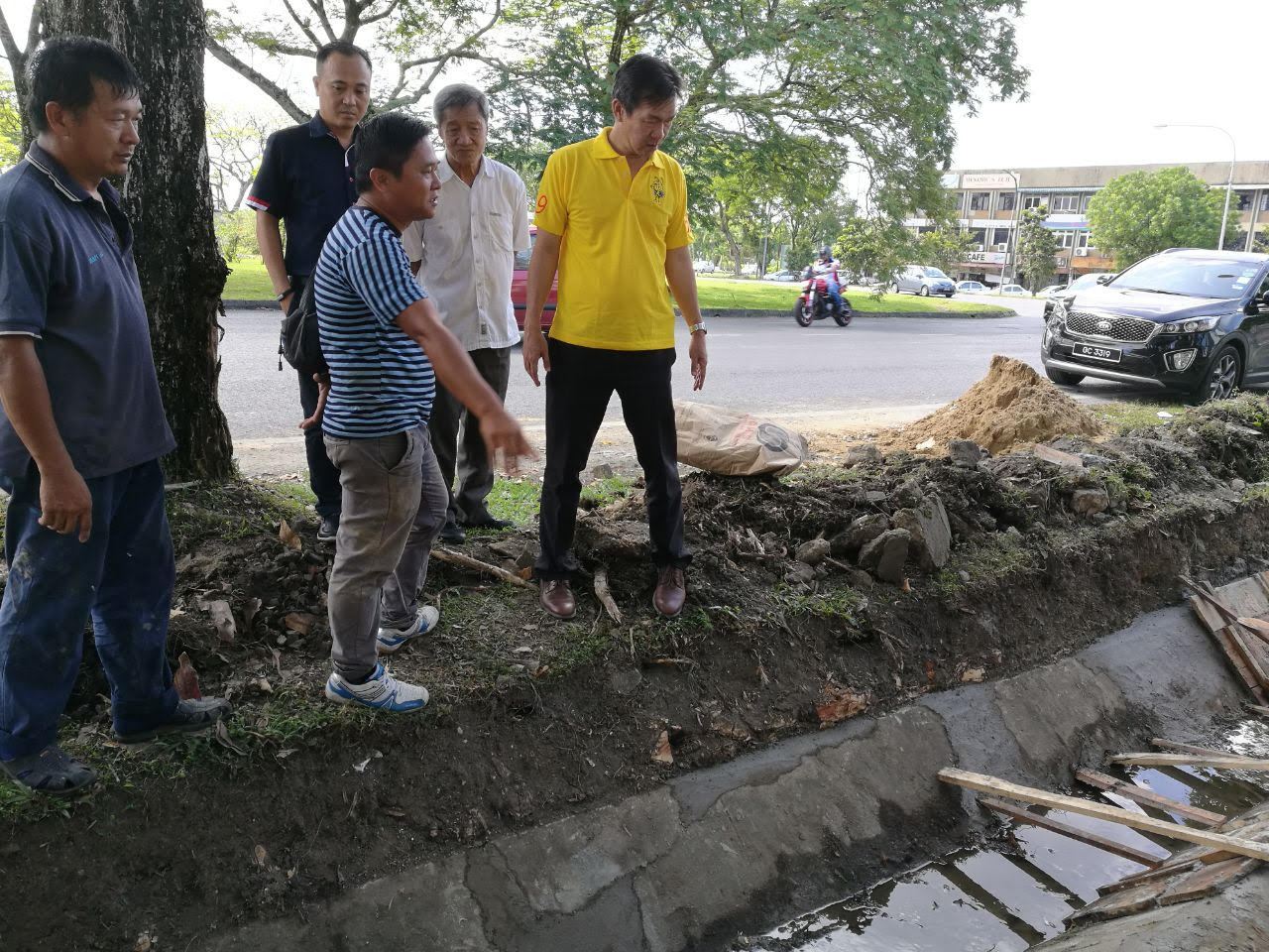日前辉盛花园居民要求砂拉越人民联合党公共投诉局主任叶耀星及甲必丹钟奕陌协助向相关部门反映位于辉盛交通圈沟渠崩塌的问题。