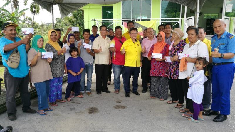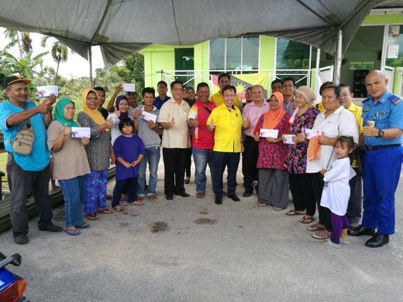 砂地方政府部长兼石角区州议员拿督沈桂贤与砂民防局官员于日前前往石角区的登雅双溪甘榜,分发水灾抚恤金予8户在今年年初受水灾影响的家庭。