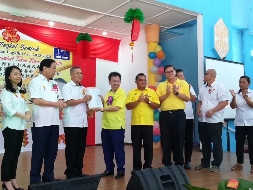 英吉利里支部主席丹迪在仪式上,移交150名新党员入党表格予沈桂贤。