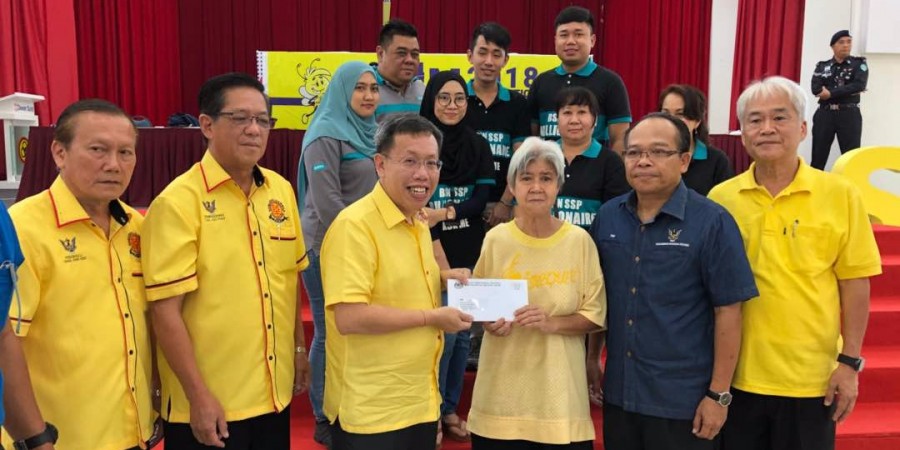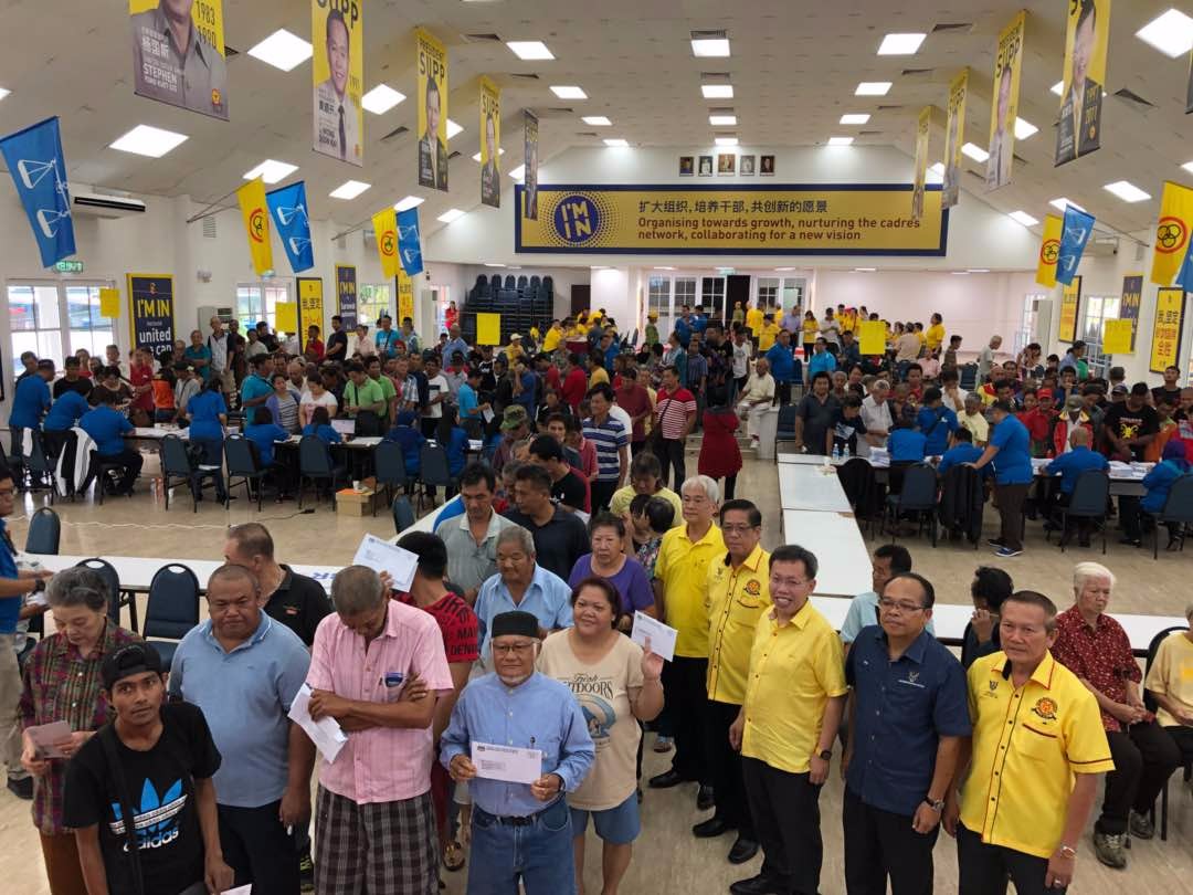砂人联党主席拿督沈桂贤于日前在党总部颁发一马援助金现金券予受