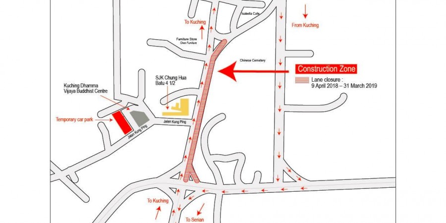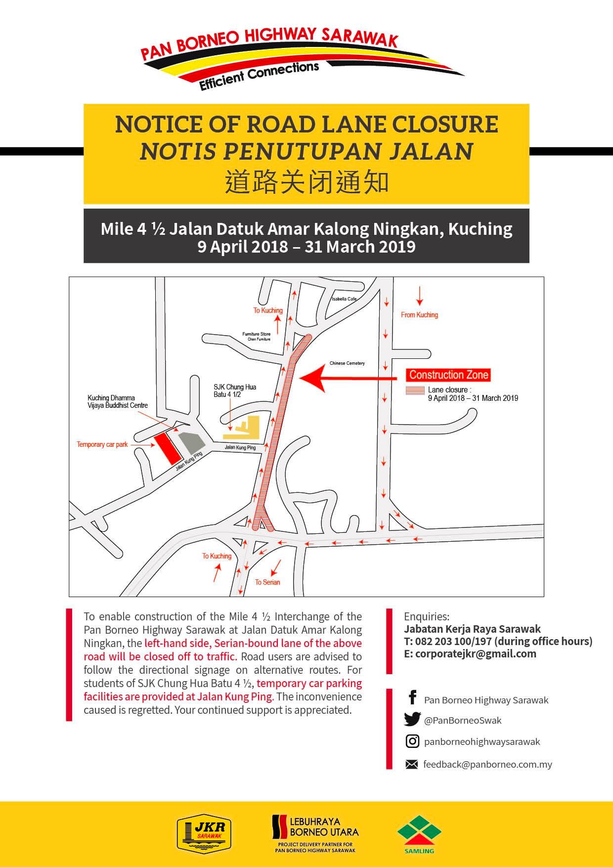 The Serian bound lane of Jalan Datuk Amar Kalong Ningkan will be closed for traffic starting 9 April 2018 to 31 March 2019 to make way for construction of Mile 4 ½ Interchange at the Kuching – Serian Road stretch of the Pan Borneo Highway Sarawak.