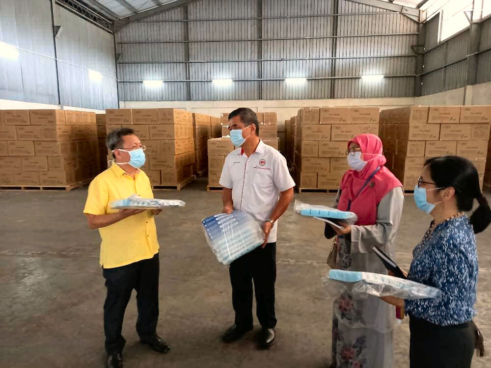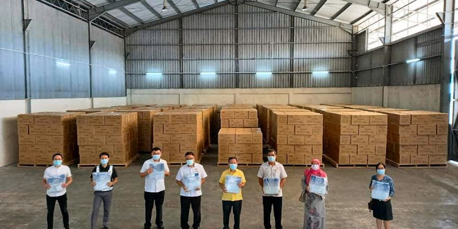 砂地方政府及房屋部长拿督斯里沈桂贤今日与砂卫生局局长钱仁兴等人一起接收45万个面罩,这批前线抗疫物资是从中国济宁市运输至古晋,装在总共2250纸箱盒内。