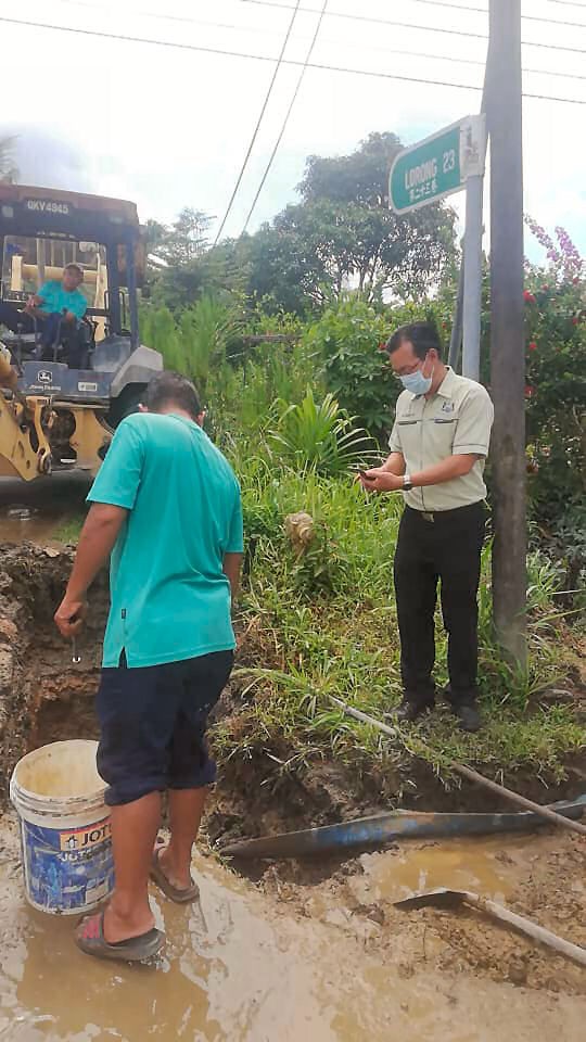 During a recent “turun padang” visit to Stampin Resettlement Scheme, the residents had complained about a burst main water pipe at Lorong 23, Jalan Stampin Baru causing great inconveniences to them. Following the request for assistance received, the complaint was immediately communicated to Kuching Water Board and the burst main water pipe have been repaired.
