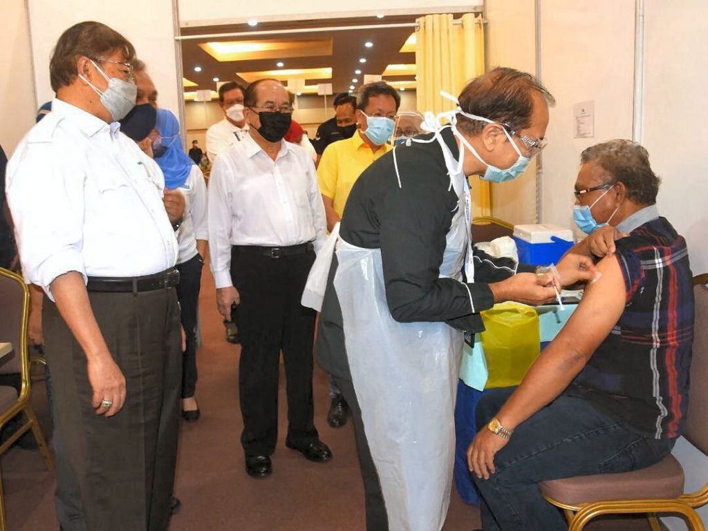 Local government and Housing Minister, Dato Sri Dr Sim Kui Hian who was with Chief Minister, Datuk Patinggi Abang Johari Tun Openg at the vaccination centre at UNIMA.