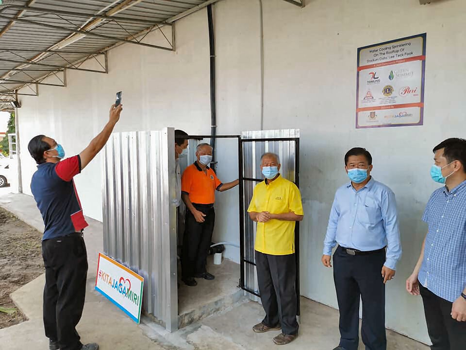 Piasau State Assemblyman, Datuk Sebastian Ting with Kita Jaga Miri team, RRSS school board, Miri Lions Clubs and contractors witness the launching of Cooling Spingklering system at Dato Lee Teck Fook Stadium, Riam recently.