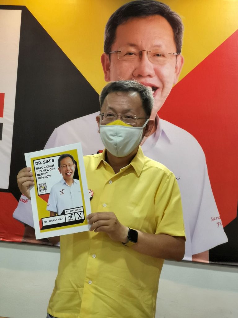 Candidate for Batu Kawa, Dato Sri Dr. Sim Kui Hian showed his report cards, work done for the past five years this morning at his Batu Kawa SUPP Centre.