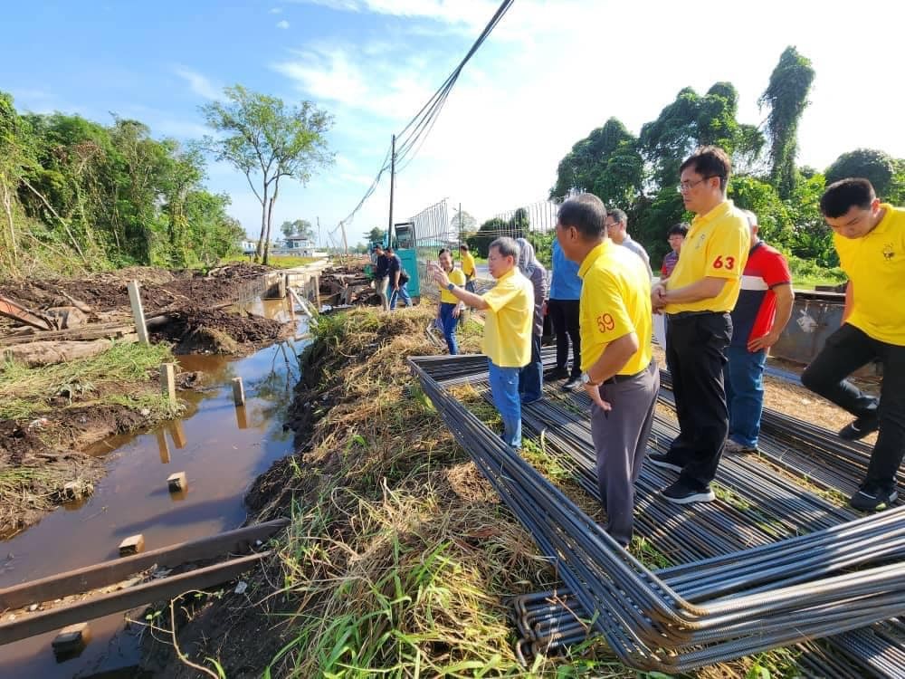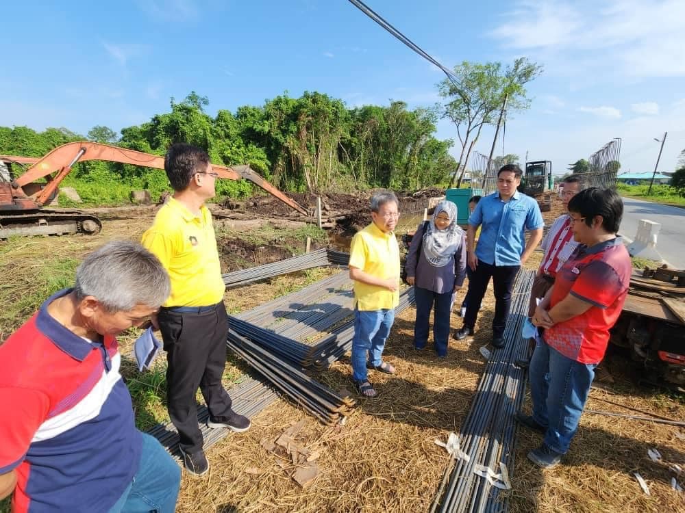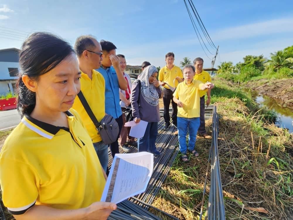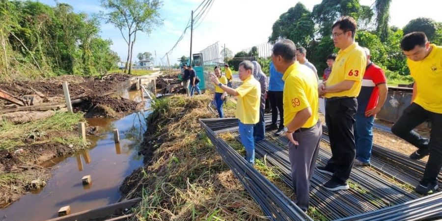 砂副总理兼公共卫生、房屋及地方政府部长拿督斯里沈桂贤与砂拉越水利灌溉局官员视察石角兵营路1.2公里沟渠提升工程。