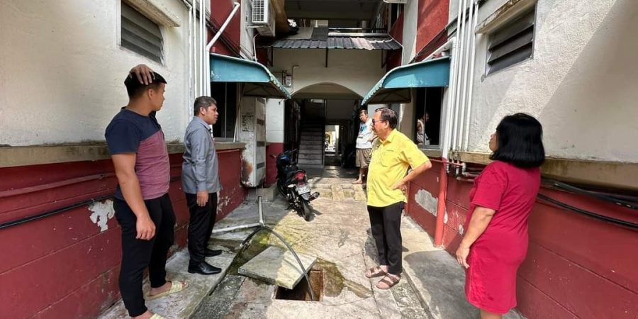 State Assemblyman Batu Kitang, Lo Khere Chiang went to check the overflow sewerage system at RPR Taman Flora Indah along Jalan Arang yesterday with Housing Development Corporation staff(HDC) and a contractor.