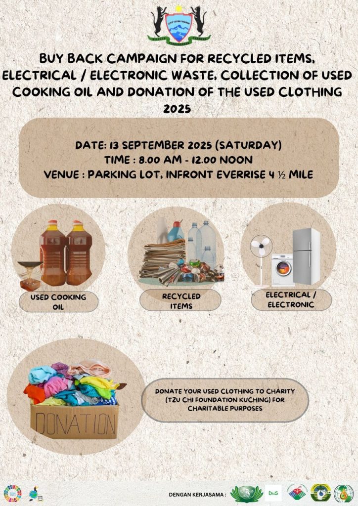 Padawan Municipal Council (MPP) will be organising the Recycling Buy-Back Campaign for Recyclables, E-Waste Collection, Used Cooking Oil Collection, and Pre-Loved Clothing Donation in collaboration with various agencies and NGOs including the Natural Resources and Environment Board (NREB), Department of Environment (DOE), DNS Waste Management Sdn. Bhd., Kim Huang Enterprise, and Tzu Chi Foundation Kuching.