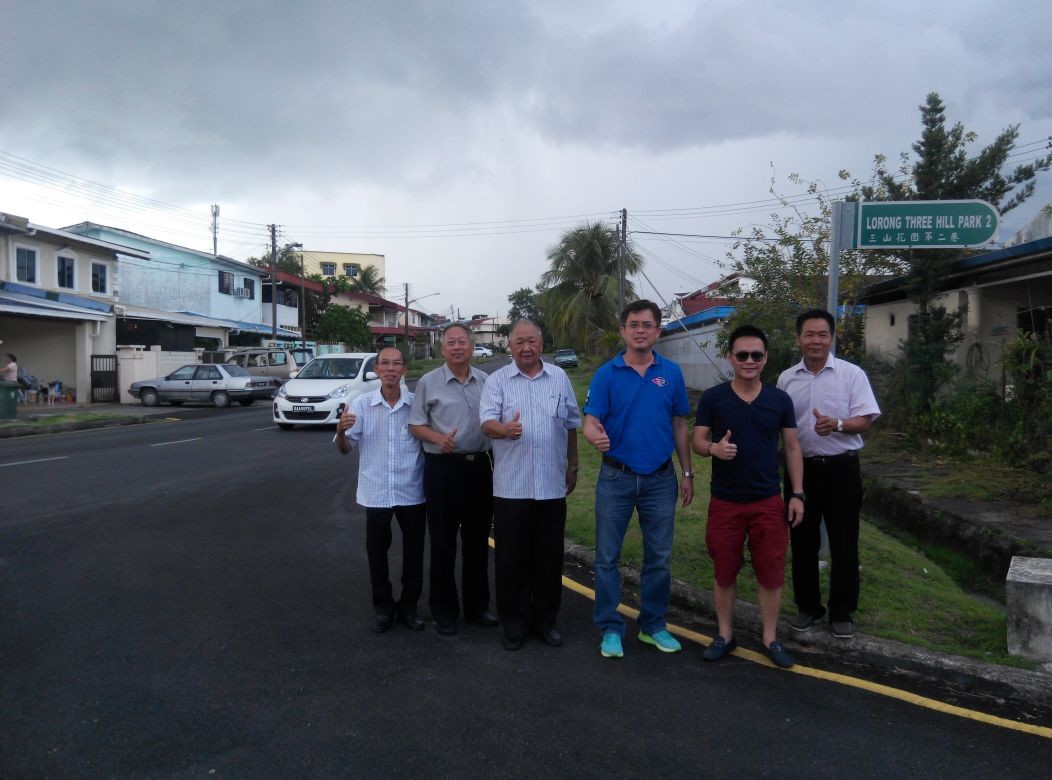 近期,在古晋三山花园,宝明园一带的沥青铺设工程已完成,砂人联青总团长兼古晋南市工程与交通小组主席陈开市议员,与许多当地地方领袖一起实地现防堪查工程品质,并表示满意工程进度与品质。