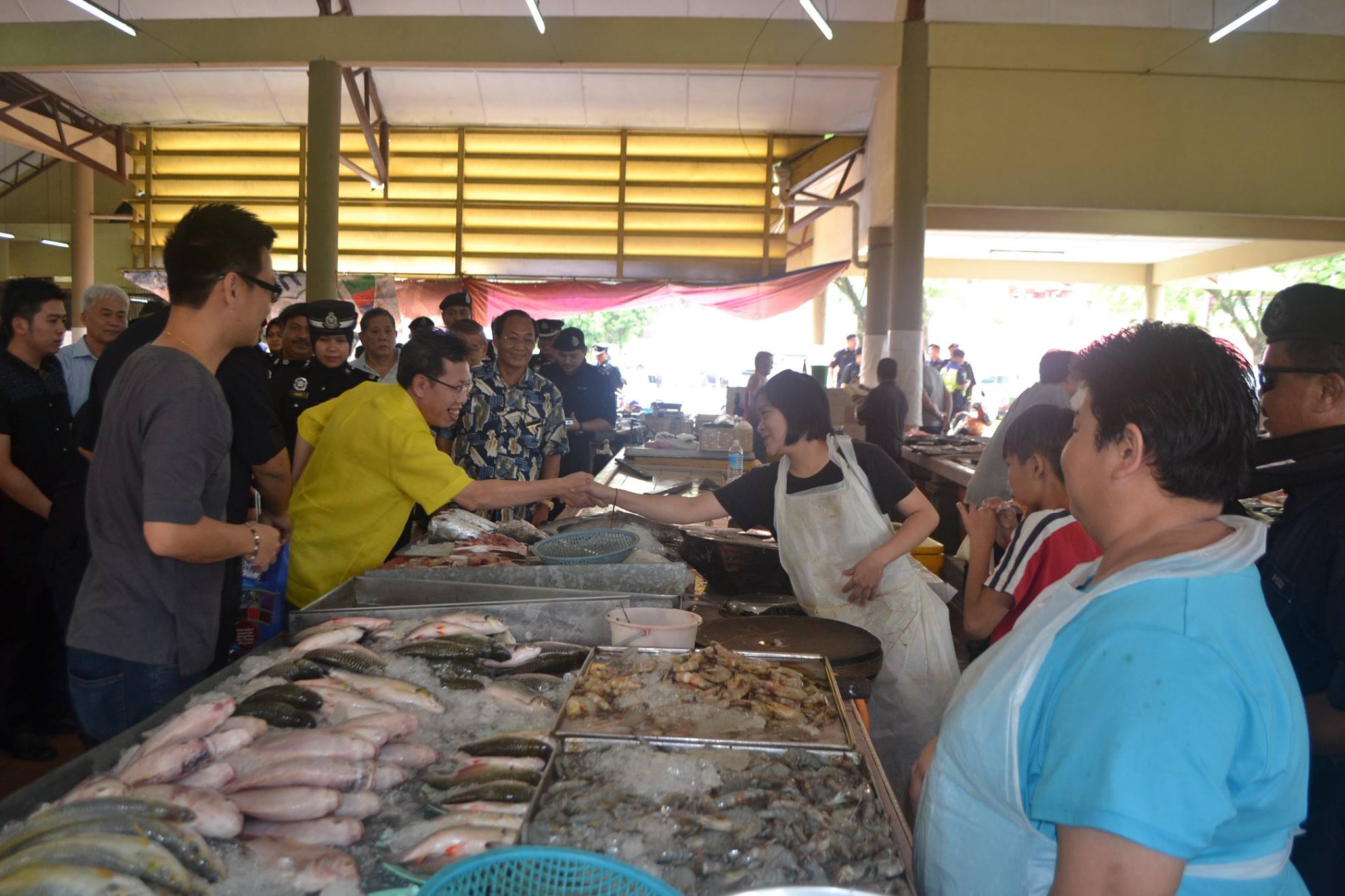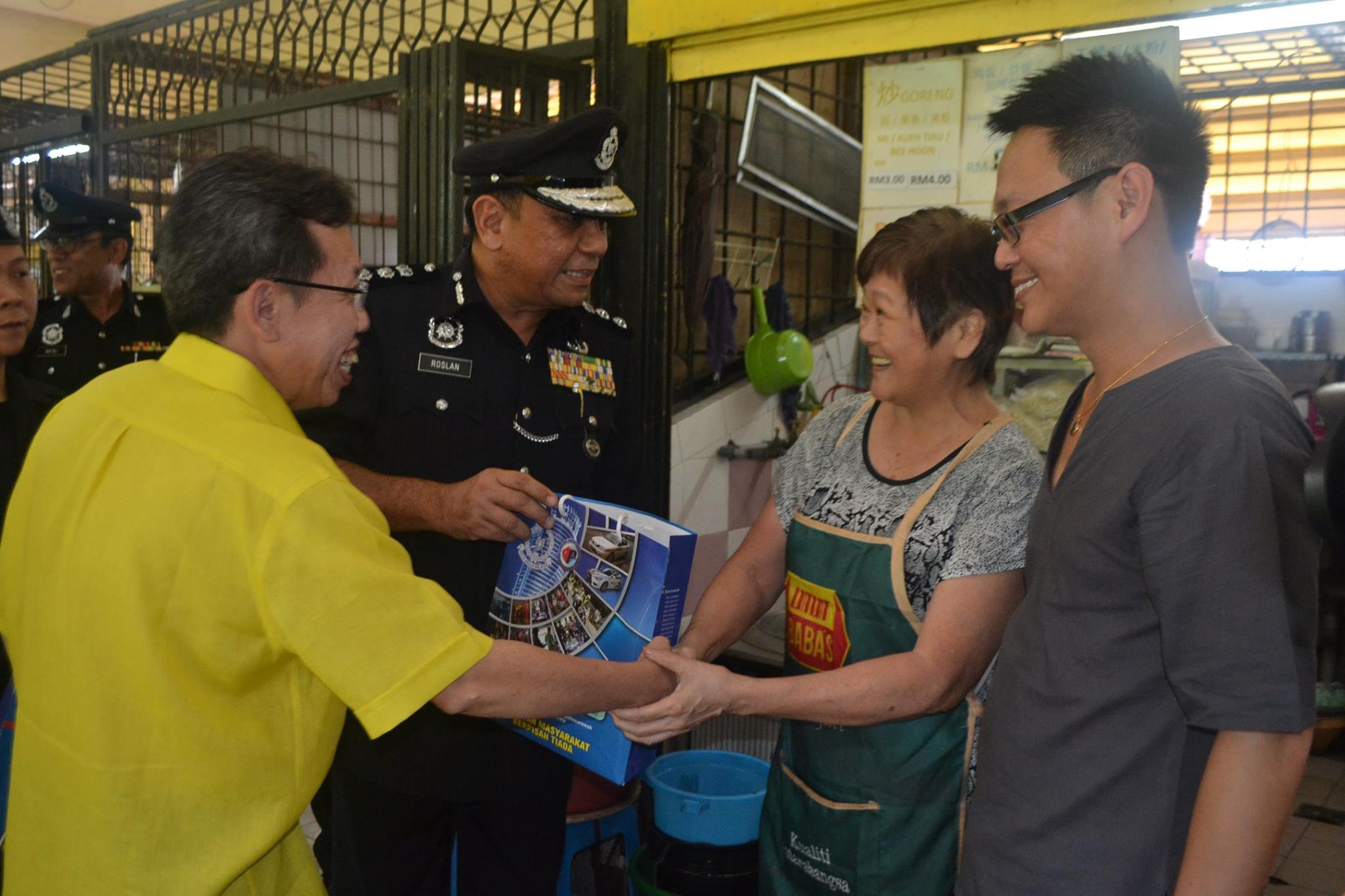 砂人联党党主席拿督沈桂贤上议员、古晋警区主任罗斯兰及砂人联青宣教秘书兼朋岭支部青年团秘书符祥威律师于日前前往新渔村小贩中心巡视及张贴警方热线电话贴纸。
