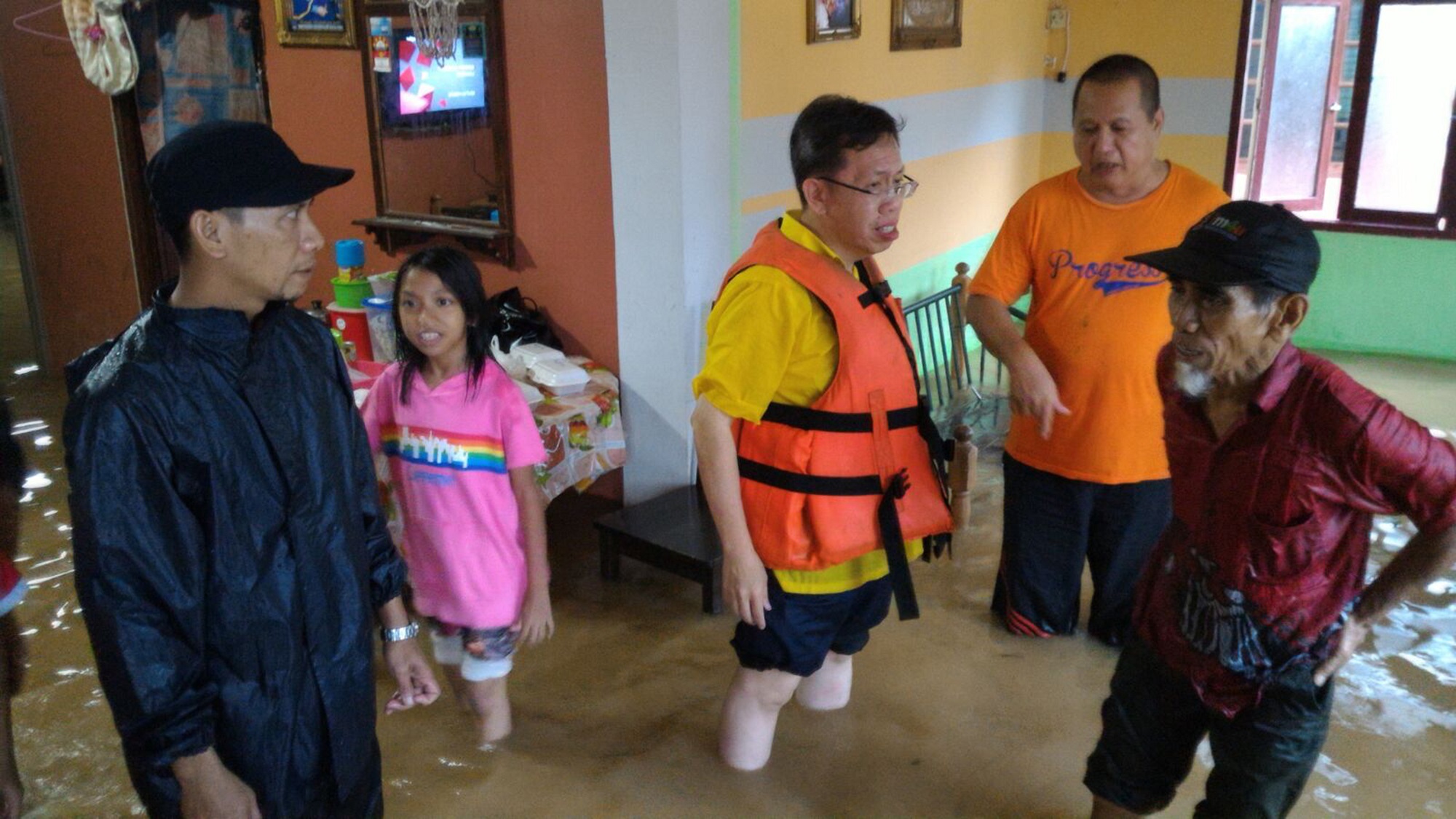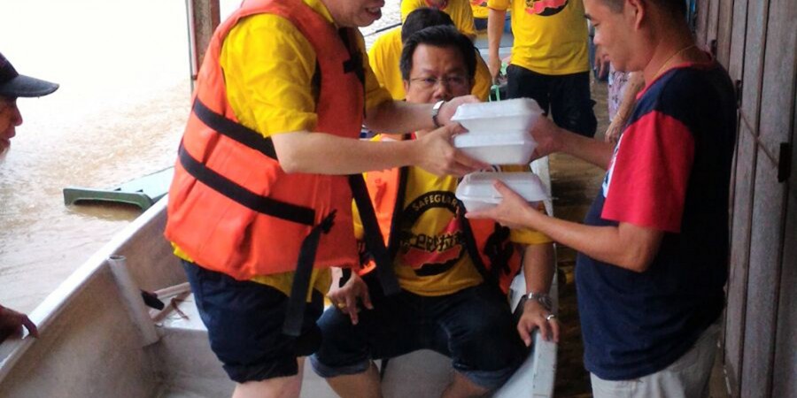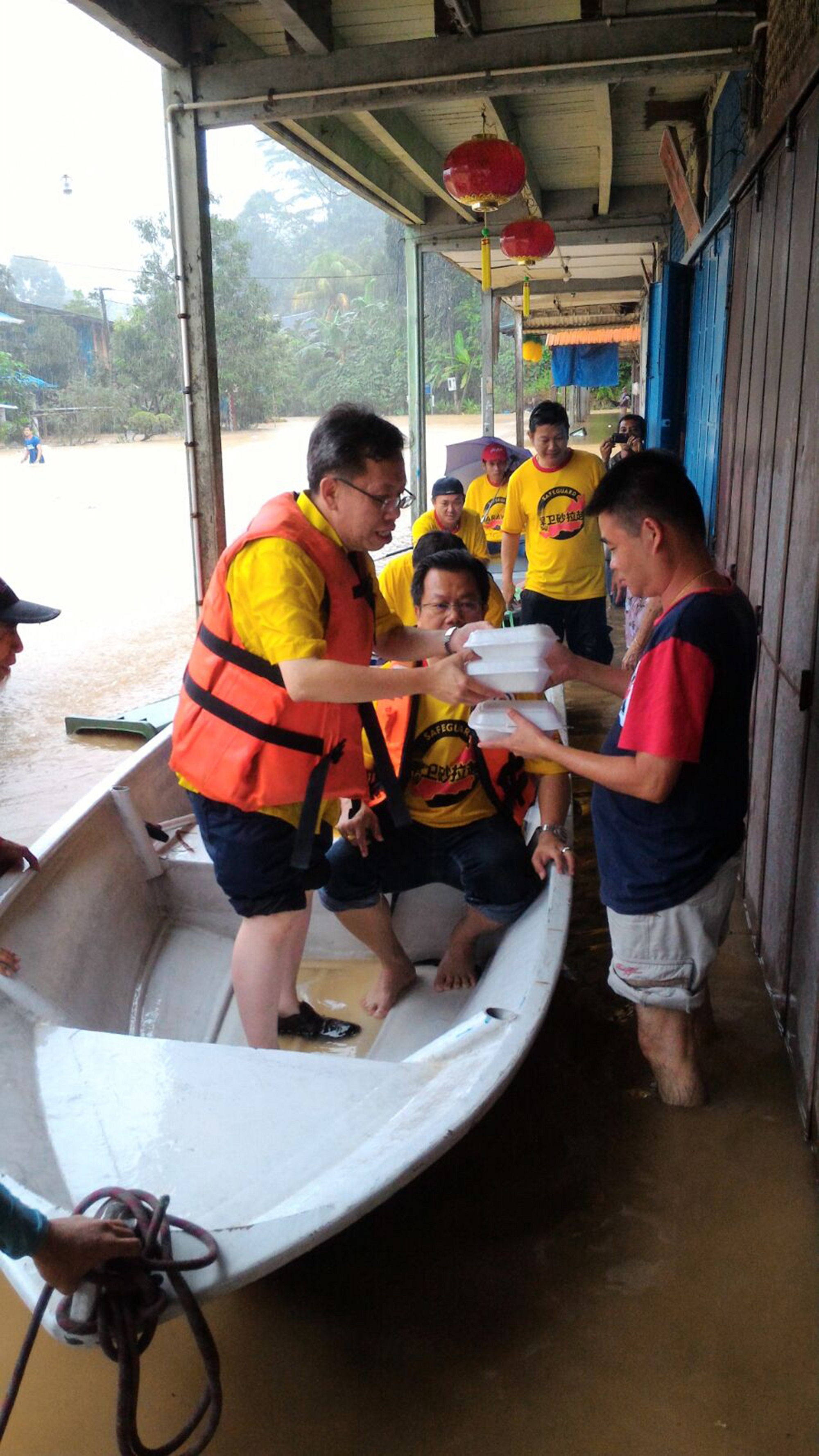 昨日连绵豪雨引发水灾,多个低洼地区沦陷,砂人联党主席拿督沈桂贤上议员亲自率领党员在第一时间援助灾黎。他于中午与来自石角支部的数名党员前往巴都吉当,并在当地乘坐舢板,向困在店屋内的灾黎递送食物。